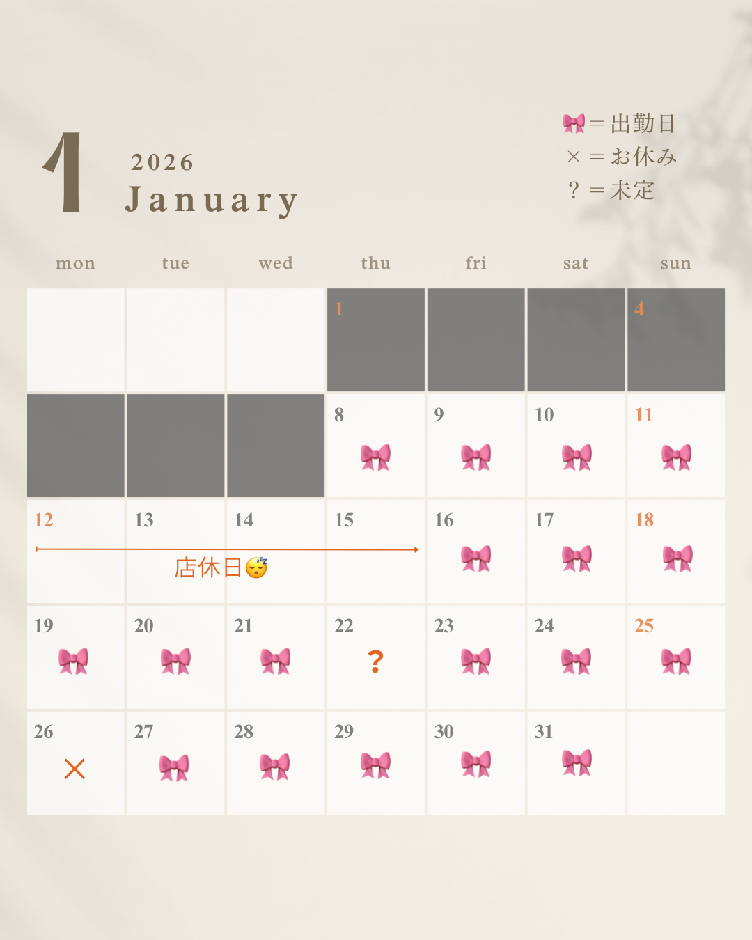 2026年1月の出勤カレンダーに変更がありますので