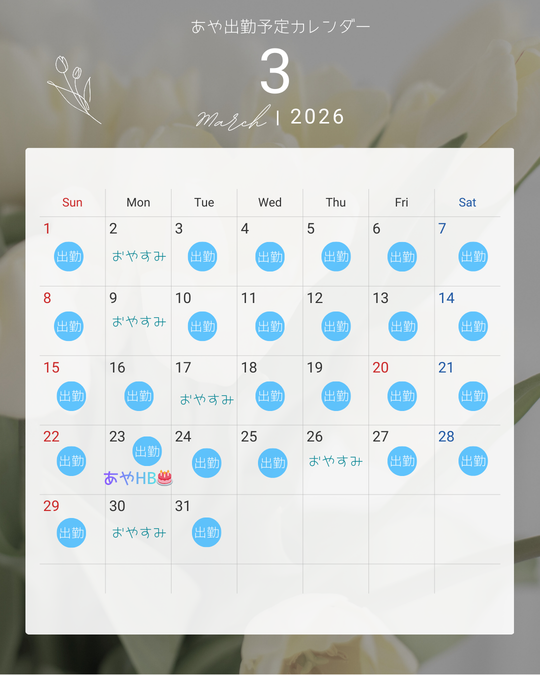 2026年3月の出勤カレンダーと、